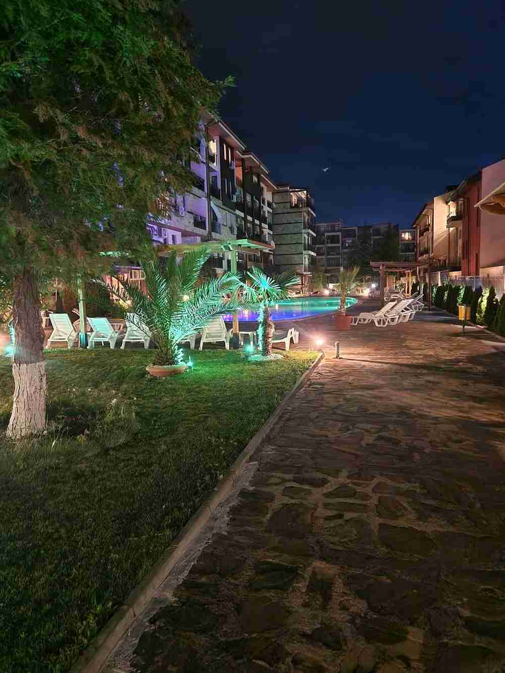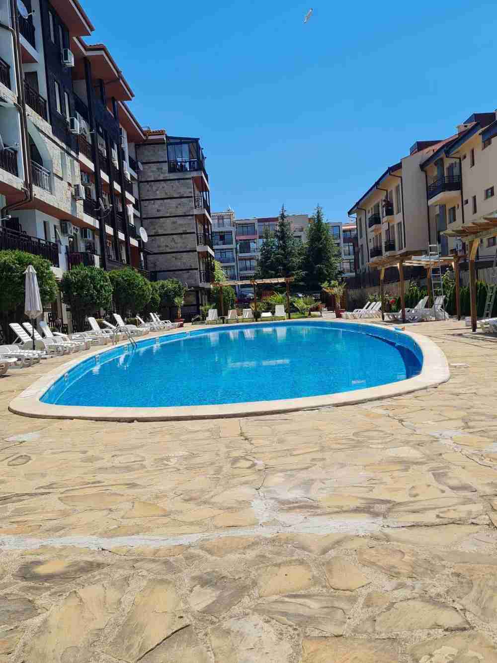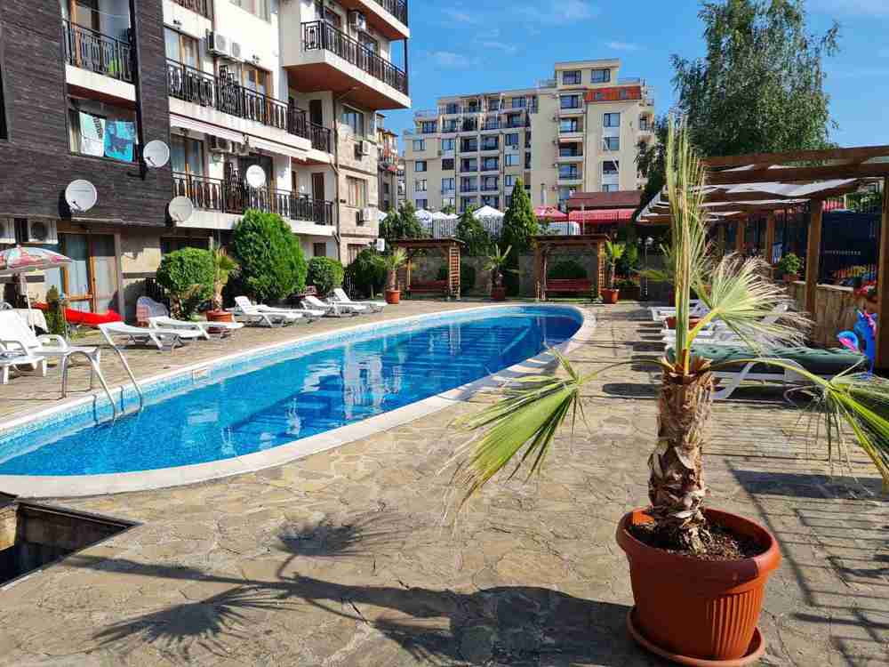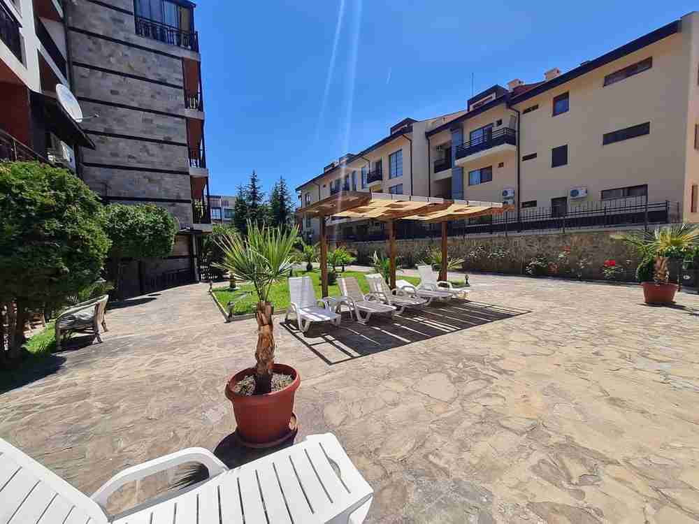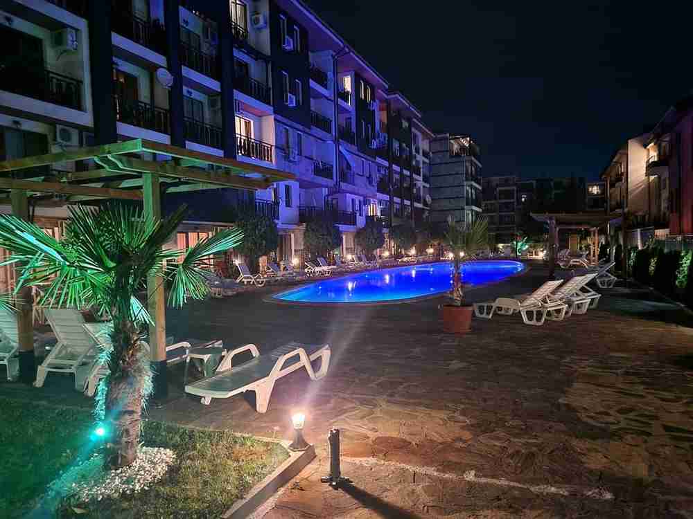 Жилището е разположено на втори етаж и е с площ 75 кв.м. Състои се от всекидневна с кухня, спално помещение, баня със санитарен възел и балкон. Комплекса е затворен, разполага с два открити басейна, зелена площ, детска площадка, зони за отдих. Годишна такса поддръжка - 600 Е