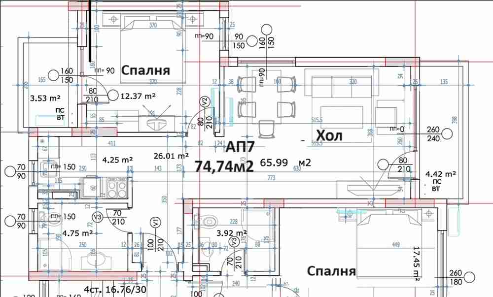 Предлагаме Ви двустаен апартамент в сградата съответно на етаж 3 от 4. Обща площ 74.33 кв.м. чиста площ 65.99кв.м. Разпределеие на имота - входно антре, дневна с трапезария, кухненски бокс, спалня, баня и тоалетна, тераса.