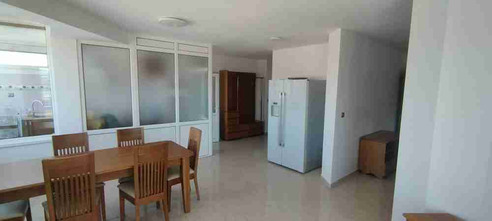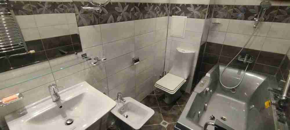 Разпределението е следното: светъл кухненски бокс, трапезария с дневна част, тераса, малък хол, две спални, от които едната е голяма със самостоятелна баня с тоалетна с хидромасажна кабина с парна баня, втора баня с тоалетна с хидромасажна вана, тип джакузи. И двете бани разполагат с биде и висококачествено обзавеждане за баня.
