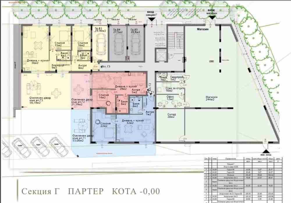 Предлагаме Ви тристаен апартамент в сграда Г, съответно на етажи - партер. Обща площ 129.96кв.м. чиста площ 110.10кв.м.,гараж - 23.43кв.м., собствен озеленен двор - 56.10кв.м.