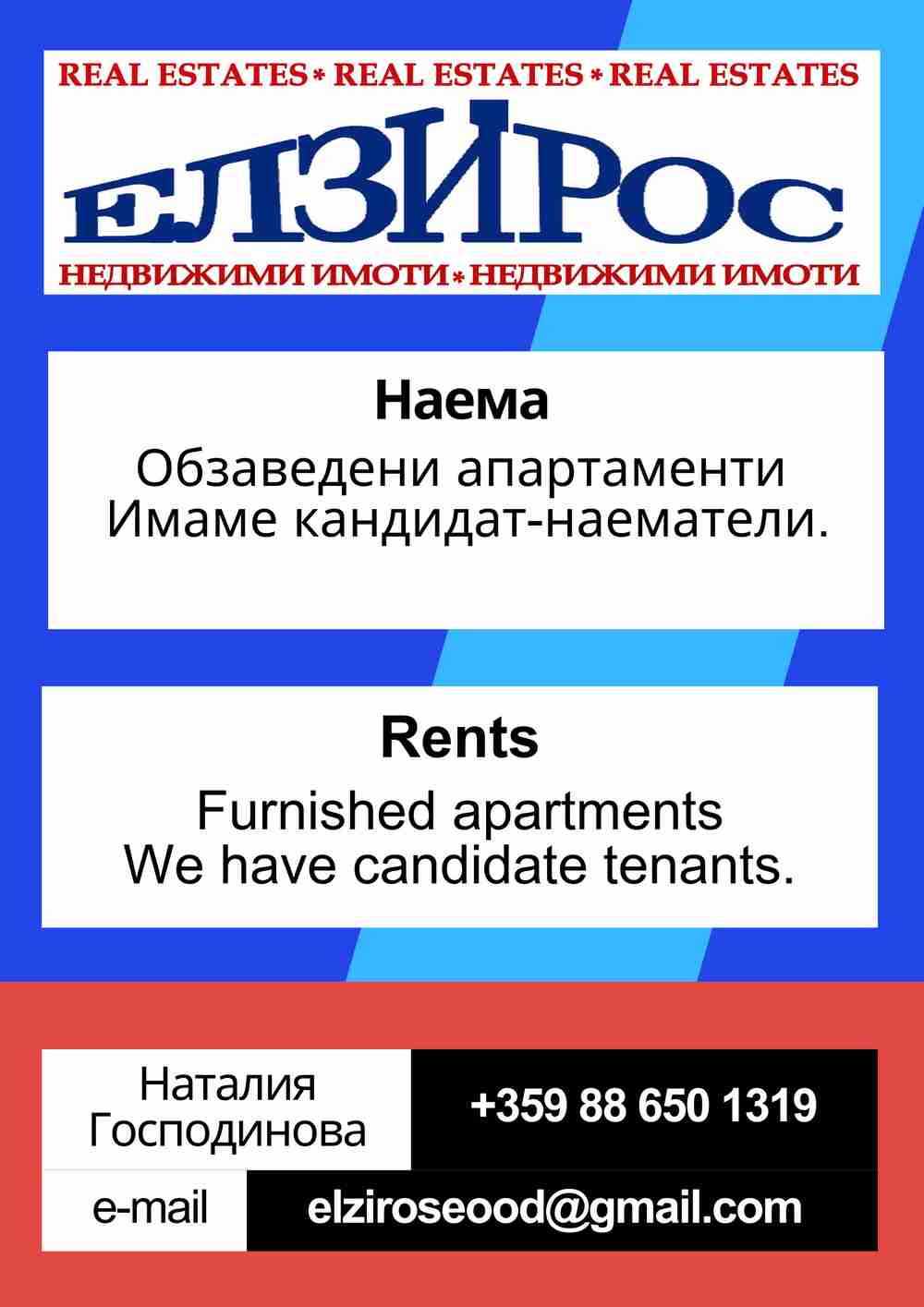 | Para contactar: | Empresa: ЕЛЗИРОС ЕOOД Pais: Bulgaria Localidad: гр.Кюстендил Dirección: ул. Демокрация №37, ет. 1, офис 2 Teléfonos de contacto: 0886501319 E-mail: elziroseood@gmail.com |